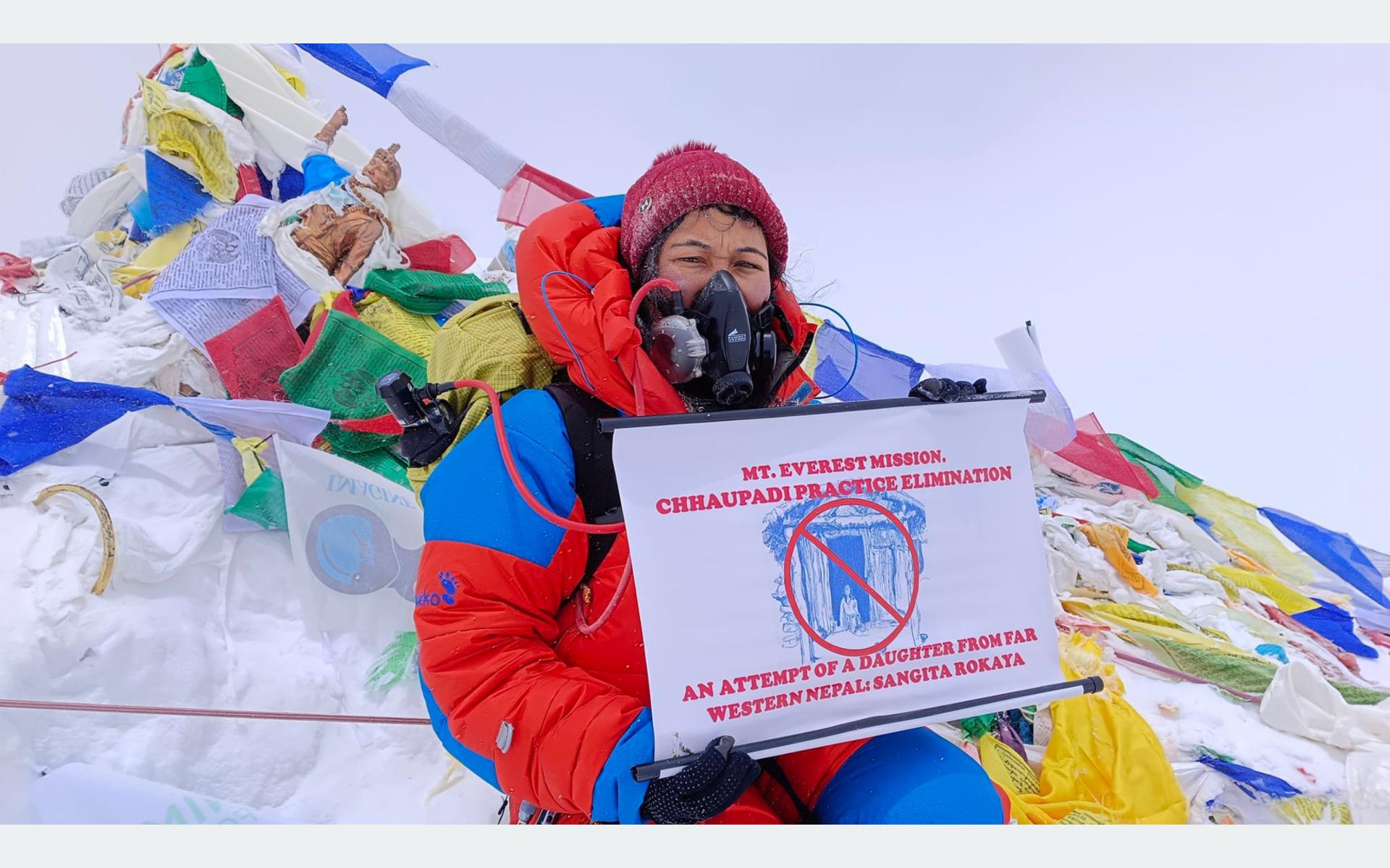 बझाङ, जेठ १६ः बझाङको साइपाल गाउँपालिका–४ धुलीकी संगीता रोकाया ‘छाउपडी प्रथा अन्त्य’ को सन्देशसहित सर्वोच्च शिखर सगरमाथाको चुचुरोमा पुग्ने पहिलो बझाङी हुन् । २६ वर्षीया उनले पायोनियर एड्भेन्चर कम्पनीको सहयोगमा...