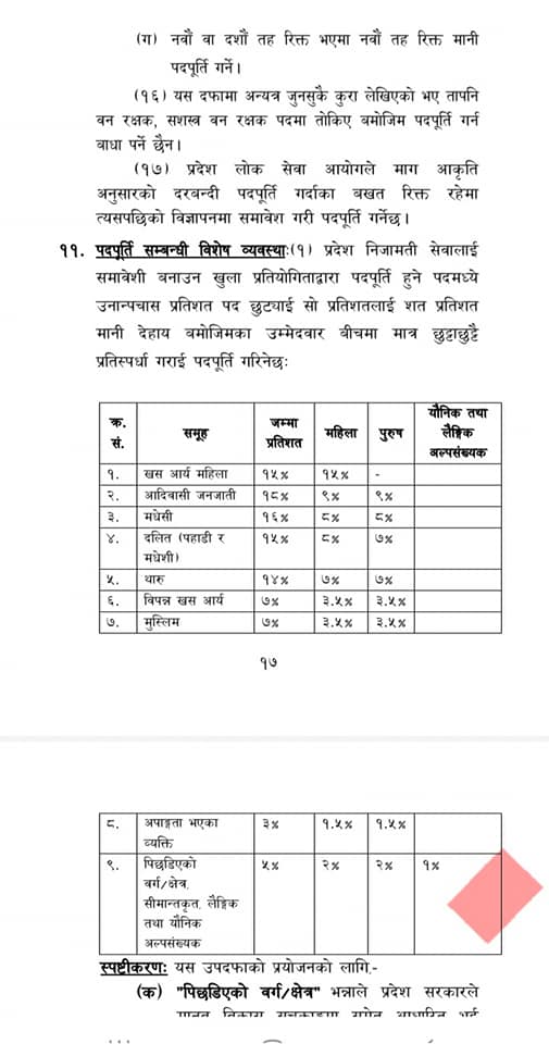 ऐनमा गरिएको पदपूर्ति सम्बन्धी विशेष व्यवस्था अनुसार प्रदेश निजामती सेवालाई समावेशी बनाउन खुला प्रतियोगिताद्वारा पदपूर्ति हुने पदमध्ये ४९ प्रतिशत पद छुट्ट्याई सो प्रतिशतलाई शत प्रतिशत मान्नु पर्ने भनिएको छ।