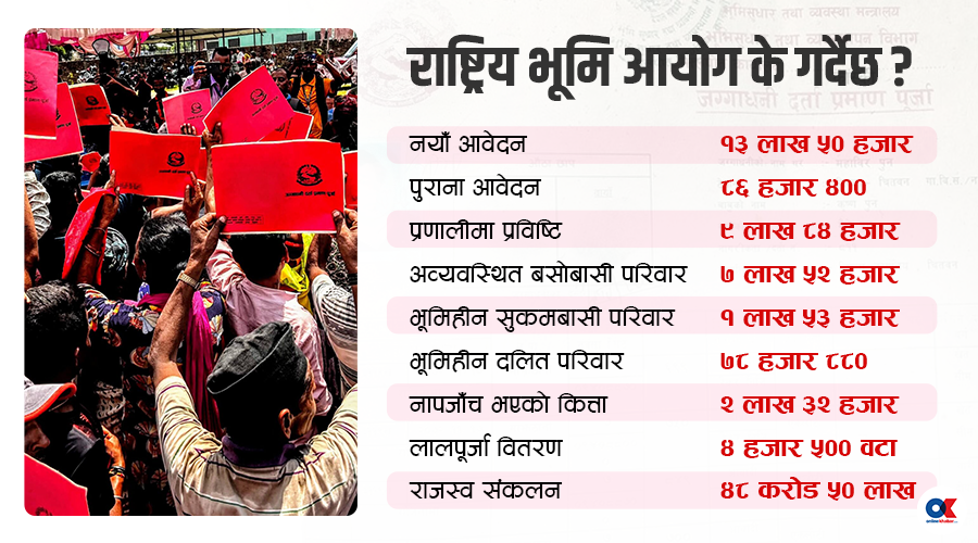 अहिलेसम्म आयोगले १३ लाख ५० हजार नयाँ आवेदन संकलन गरिसकेको छ । विगतका भूमिसमबन्धी आयोगहरुले प्रक्रिया अघि बढाएर लालपुर्जा बनेर पनि वितरण नभएको, श्रेस्ता बनेर वितरण गर्न नपाएको, वितरण भइसके पनि मोठ कायम नभएको जस्ता जग्गाका दाबेदारहरुले आयोगमा ८६ हजार ४०० निवेदन दर्ता गराएका छन् ।